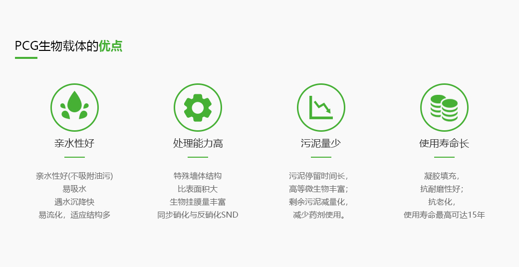 PCG是一種以高分子親水材料為基材的水處理生物載體產品,源自日本設計靈感,參考日本20年左右的應用經(jīng)歷。我司技術研發(fā)團隊從2010年開始對軟性生物載體進行開發(fā),經(jīng)過6年的設計與開發(fā),最終選擇以高親水性,生物親和性,抗磨損性,通氣性及強大的比表面積的高分子新材料作為生物載體的基材,并于2016年問世。歷經(jīng)5年的小試與中試試驗,最終于2020年投入規(guī)模化生產。作為生物載體,PCG領先于國內同類型產品。